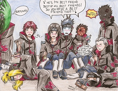 V domě se skrývala opravdu dosti velká zásoba alkoholu. Tobi škemral o kapičku. Zetsu nad tím nakonec mávl rukou a dal mu celou lahev. Sasori nepil, ostatní si ho nevšímali. Vyhrabal odněkud flétnu a začal na ni hrát. Deidara ležel na zemi na boku, v ruce pevně svíral lahev. Tobi spal Zetsuovi na klíně, ten mohl pouze sedět na místě a sledovat ostatní, jen oči mu svítily. Hidan tančil jakýsi bojový tanec, Kakuzu si hrál na akrobata. Loutkář seděl na pohovce v rozhalené košili, takže bylo dobře vidět, že má tělo loutky. Odněkud vyletěla láhev. Část Sasoriho speciálního lana se odmotala a zachytila předmět, než stačil dopadnout na zem a roztříštit se. S ledovým klidem si ji přitáhl k sobě a položil na stůl. Vzápětí strnul, když ho něco velkého a modrého vší silou objalo. Kisame měl poněkud družnou náladu, proto každého objímal.