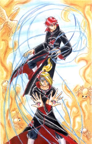„Jistě.“ Umístil na Sasoriho loutky pár svých bombiček, seskočil a jen tak tak uhnul Itachimu, který se na něj vrhl. Červenovlasý okamžitě zareagoval a hodil mu drobné jílové zvířátko pod nohy. „Teď!“