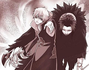 „Hele, takhle je to dva na jednoho! To se tu mám dřít sám, Uchiho?!“ rozčiloval se Sasori, zatímco odrážel dva ninji, kteří na něj zkoušeli výpady. Deidara se snažil odlákat loutkářovu pozornost, ale neútočil.